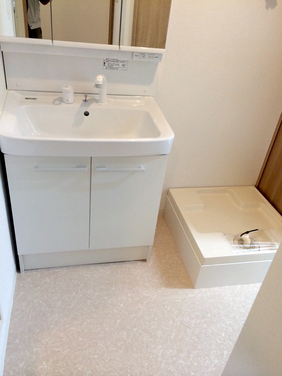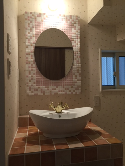 お客様の要望で、明るく、清潔感のある洗面台を施工させていただきました。